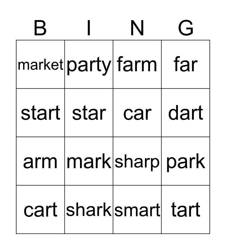 This bingo card has 16 words: shark, park, farm, market, arm, party, sharp, smart, start, star, cart, far, mark, dart, car and tart.