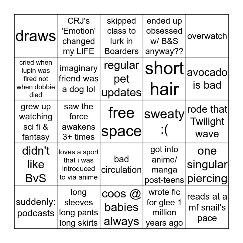 This bingo card has a free space and 24 words: loves a sport that i was introduced to via anime, long sleeves long pants long skirts, regular pet updates, suddenly: podcasts, overwatch, draws, cried when lupin was fired not when dobbie died, CRJ's 'Emotion' changed my LIFE, sweaty :(, bad circulation, short hair, grew up watching sci fi & fantasy, got into anime/ manga post-teens, one singular piercing, imaginary friend was a dog lol, wrote fic for glee 1 million years ago, rode that Twilight wave, skipped class to lurk in Boarders, avocado is bad, saw the force awakens 3+ times, reads at a mf snail's pace, didn't like BvS, ended up obsessed w/ B&S anyway?? and coos @ babies always.