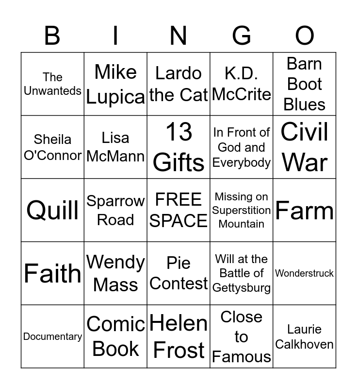 This bingo card has a free space and 50 words: Brian Selznick, Laurie Calkhoven, Sarah Weeks, Helen Frost, Wendy Mass, Elise Broach, Mike Lupica, Catherine Friend, Sheila O'Connor, Joan Bauer, Lisa McMann, K.D. McCrite, Wonderstruck, Will at the Battle of Gettysburg, Pie, Hidden, 13 Gifts, Missing on Superstition Mountain, The Underdogs, Barn Boot Blues, Sparrow Road, Close to Famous, The Unwanteds, In Front of God and Everybody, New York City, Silent Actress, Civil War, Confederate Troops, Lardo the Cat, Pie Contest, Camp Oakwood, Friendship, Stuffed Goat, Willow Falls, Comic Book, Mystery, Barker Brothers, Football, Fundraising, Farm, Ducks, Artist, Secret, Cupcakes, Documentary, Quill, Artime, Creativity, Faith and Senior Citizen.