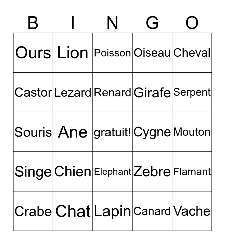 This bingo card has a free space and 24 words: Chien, Chat, Renard, Crabe, Cheval, Ours, Castor, Lion, Cygne, Elephant, Girafe, Souris, Zebre, Flamant, Lezard, Canard, Mouton, Poisson, Serpent, Ane, Vache, Singe, Oiseau and Lapin.