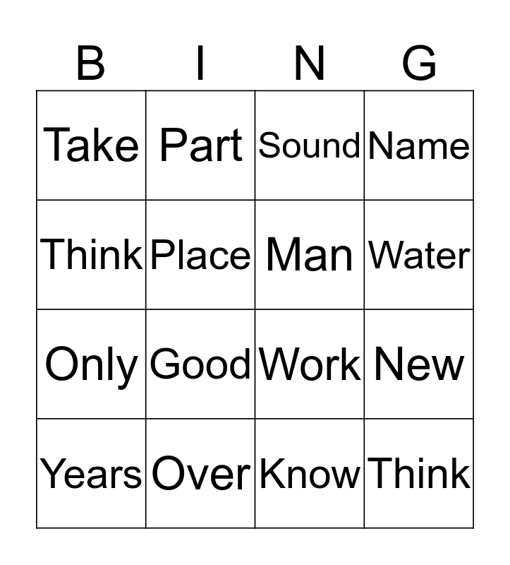 This bingo card has 16 words: Over, New, Sound, Take, Only, Part, Work, Know, Think, Place, Years, Name, Good, Water, Man and Think.