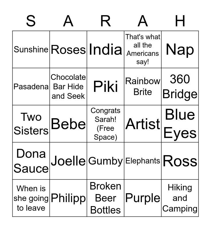 This bingo card has a free space and 25 words: Joelle, Broken Beer Bottles, Piki, When is she going to leave, Nap, Sunshine, Pasadena, Roses, Artist, Gumby, Rainbow Brite, Two Sisters, Elephants, Ross, Chocolate Bar Hide and Seek, Flying Kites, Blue Eyes, India, 360 Bridge, Bebe, Hiking and Camping, Philipp, Dona Sauce, That's what all the Americans say! and Purple.