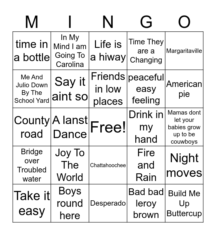 This bingo card has a free space and 50 words: Bad Moon Rising, Build Me Up Buttercup, Closing Time, Desperado, Joy To The World, I'm Yours, In My Mind I am Going To Carolina, Looking Out My Back Door, Me And Julio Down By The School Yard, On the Road Again, Say it aint so, Time They are a Changing, Night moves, Fire and Rain, How Sweet it is to be loved by you, Chicken Fried, Friends in low places, Drink in my hand, Boondocks, Margaritaville, A lanst Dance, Bad bad leroy brown, time in a bottle, peaceful easy feeling, hotel California, Ain't no sunshine when she is gone, American pie, Bartenders, Life is a hiway, Chattahoochee, I love this bar, Barefoot Blue Jean Night, Parking lot Party, Fishin in the Dark, Boys round here, Lukenbach Texas, One piece at a time, Folsom Prison Blues, I have been every where man, Mamas dont let your babies grow up to be couwboys, Walk the line, Ring of fire, Thunder rolls, Kiss an angel good morning, Take it easy, County road, Rocky mountain high, I'm leaving on a jet plane, Bridge over Troubled water and Sweet Caroline.