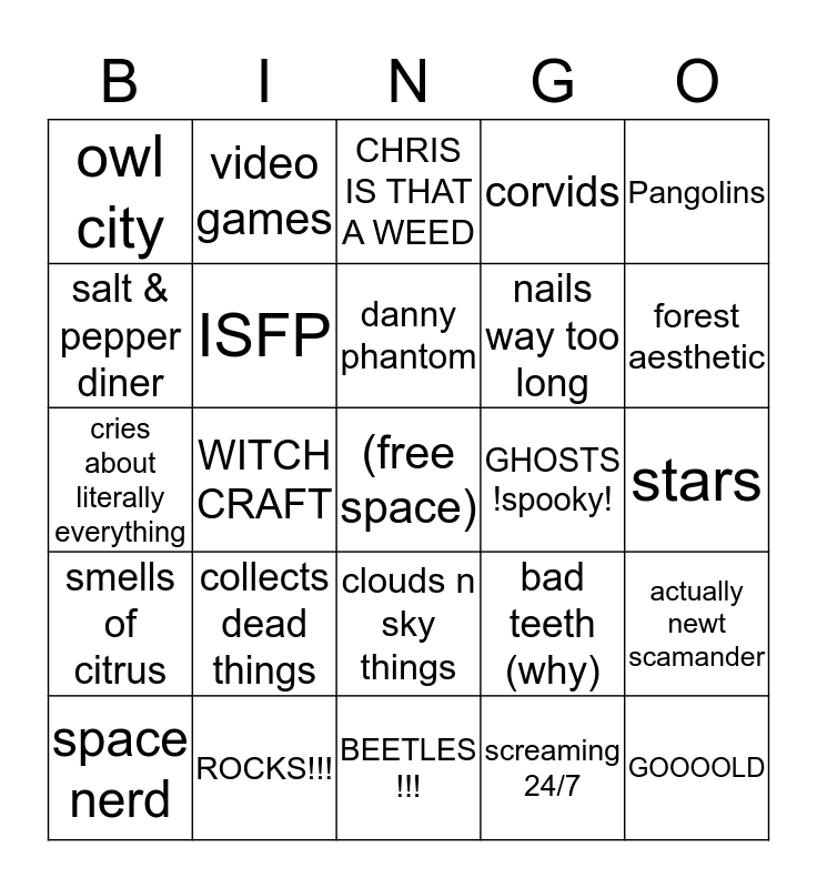This bingo card has a free space and 24 words: collects dead things, ROCKS!!!, danny phantom, space nerd, Pangolins, owl city, salt & pepper diner, video games, GHOSTS !spooky!, clouds n sky things, nails way too long, cries about literally everything, bad teeth (why), actually newt scamander, ISFP, screaming 24/7, stars, CHRIS IS THAT A WEED, forest aesthetic, WITCH CRAFT, GOOOOLD, smells of citrus, corvids and BEETLES !!!.
