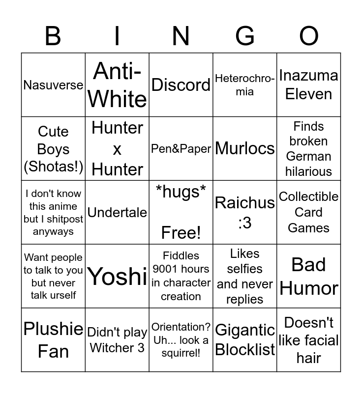 This bingo card has a free space and 24 words: Yoshi, Didn't play Witcher 3, Pen&Paper, Plushie Fan, Inazuma Eleven, Nasuverse, Cute Boys (Shotas!), Anti-White, Raichus :3, Fiddles 9001 hours in character creation, Murlocs, I don't know this anime but I shitpost anyways, Likes selfies and never replies, Bad Humor, Hunter x Hunter, Gigantic Blocklist, Collectible Card Games, Discord, Finds broken German hilarious, Undertale, Doesn't like facial hair, Want people to talk to you but never talk urself, Heterochro-mia and Orientation? Uh... look a squirrel!.