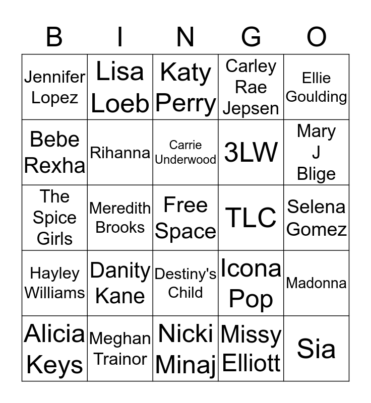 This bingo card has a free space and 24 words: Danity Kane, Meghan Trainor, Carrie Underwood, Alicia Keys, Ellie Goulding, Jennifer Lopez, Bebe Rexha, Lisa Loeb, TLC, Destiny's Child, 3LW, The Spice Girls, Icona Pop, Madonna, Rihanna, Missy Elliott, Selena Gomez, Katy Perry, Mary J Blige, Meredith Brooks, Sia, Hayley Williams, Carley Rae Jepsen and Nicki Minaj.