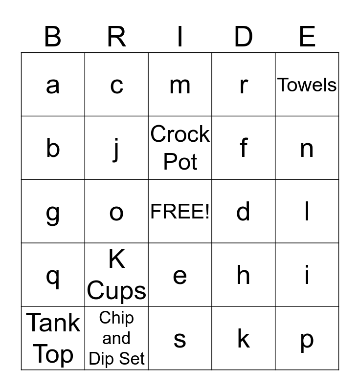 This bingo card has a free space and 24 words: K Cups, Chip and Dip Set, Crock Pot, Tank Top, Towels, a, b, c, d, e, f, g, h, i, j, k, l, m, n, o, p, q, r and s.
