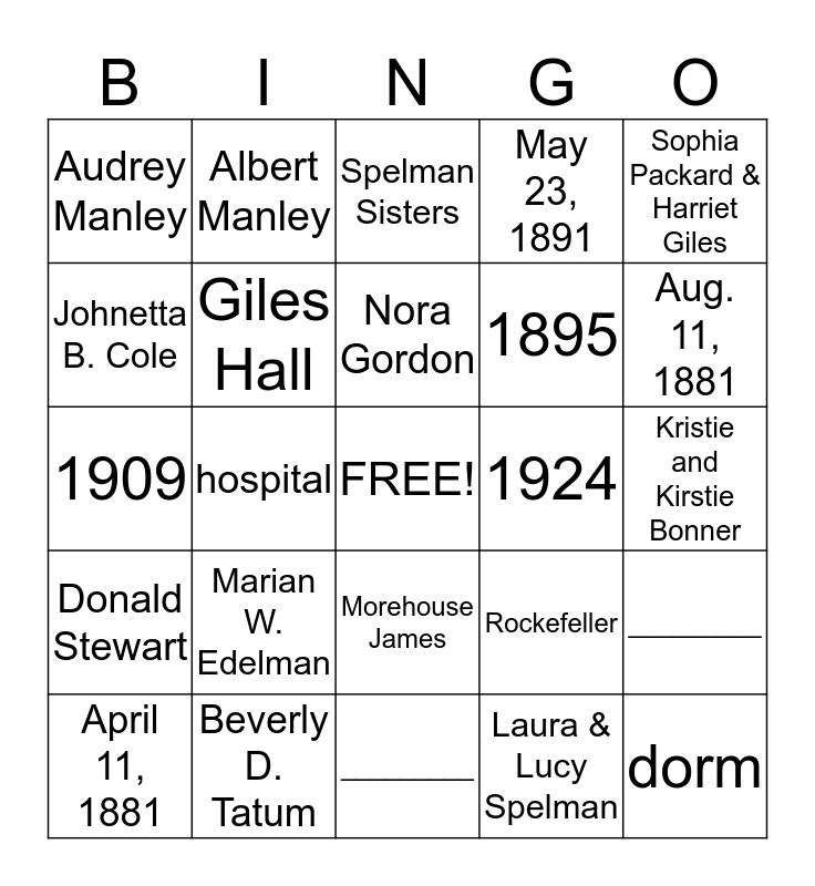 This bingo card has a free space and 24 words: Marian W. Edelman, Beverly D. Tatum, Nora Gordon, April 11, 1881, Sophia Packard & Harriet Giles, Audrey Manley, Johnetta B. Cole, Albert Manley, 1924, Morehouse James, 1895, 1909, Rockefeller, _________, Giles Hall, Laura & Lucy Spelman, Kristie and Kirstie Bonner, Spelman Sisters, Aug. 11, 1881, hospital, dorm, Donald Stewart, May 23, 1891 and _________.