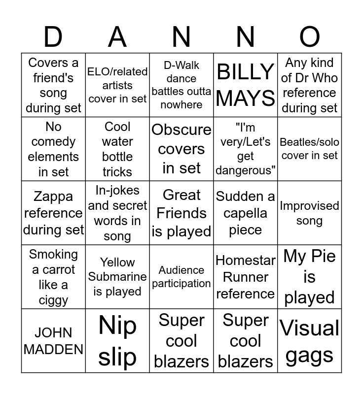 This bingo card has a free space and 34 words: Hawaiian Shirts, Super cool blazers, "Simma Down Girl!", Table Jumping, Smoking a carrot like a ciggy, Cool water bottle tricks, Any kind of Dr Who reference during set, JOHN MADDEN, ELO/related artists cover in set, "Simma Down Girl!", Obscure covers in set, D-Walk dance battles outta nowhere, Bucket hat is worn, HYPNOVISION goggles used, Sudden a capella piece, Beatles/solo cover in set, Nip slip, Zappa reference during set, Yellow Submarine is played, Homestar Runner reference, Audience participation, Self-Deprecation, Covers a friend's song during set, Improvised song, Super cool blazers, Visual gags, BILLY MAYS, Water gargling solos, "I'm very/Let's get dangerous", No comedy elements in set, Danny plays a song/set with friends, In-jokes and secret words in song, My Pie is played and Refusing to play Great Friends.