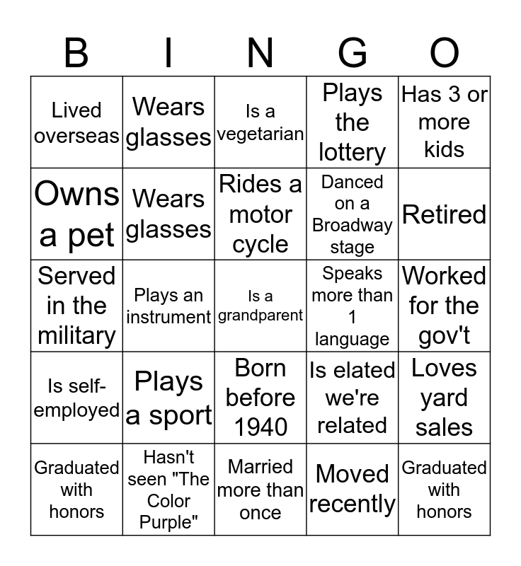 This bingo card has 25 words: Plays a sport, Married more than once, Rides a motor cycle, Graduated with honors, Has 3 or more kids, Lived overseas, Owns a pet, Wears glasses, Speaks more than 1 language, Born before 1940, Danced on a Broadway stage, Served in the military, Is elated we're related, Loves yard sales, Wears glasses, Graduated with honors, Worked for the gov't, Is a vegetarian, Retired, Plays an instrument, Is a grandparent, Hasn't seen "The Color Purple", Is self-employed, Plays the lottery and Moved recently.