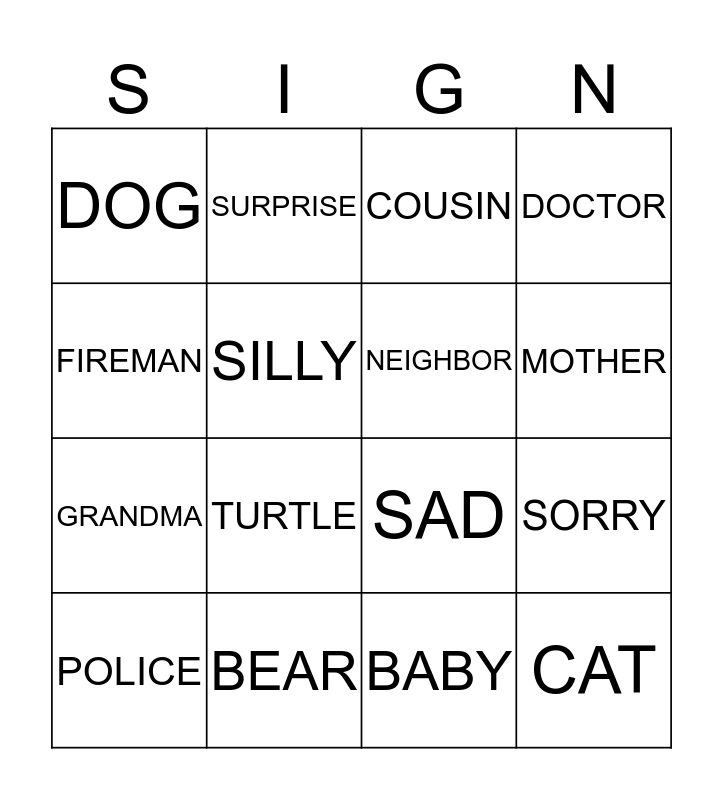 This bingo card has 16 words: BEAR, SORRY, COUSIN, DOG, GRANDMA, SURPRISE, SAD, BABY, FIREMAN, SILLY, POLICE, DOCTOR, TURTLE, MOTHER, NEIGHBOR and CAT.