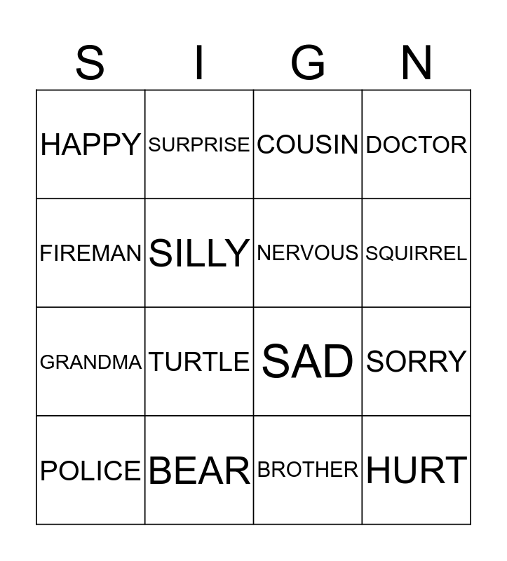 This bingo card has 16 words: BEAR, SORRY, COUSIN, HAPPY, GRANDMA, SURPRISE, SAD, BROTHER, FIREMAN, SILLY, POLICE, DOCTOR, TURTLE, SQUIRREL, NERVOUS and HURT.