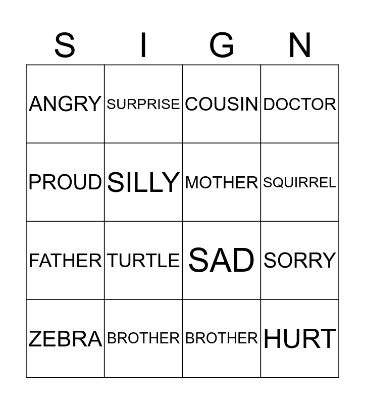 This bingo card has 16 words: BROTHER, SORRY, COUSIN, ANGRY, FATHER, SURPRISE, SAD, BROTHER, PROUD, SILLY, ZEBRA, DOCTOR, TURTLE, SQUIRREL, MOTHER and HURT.