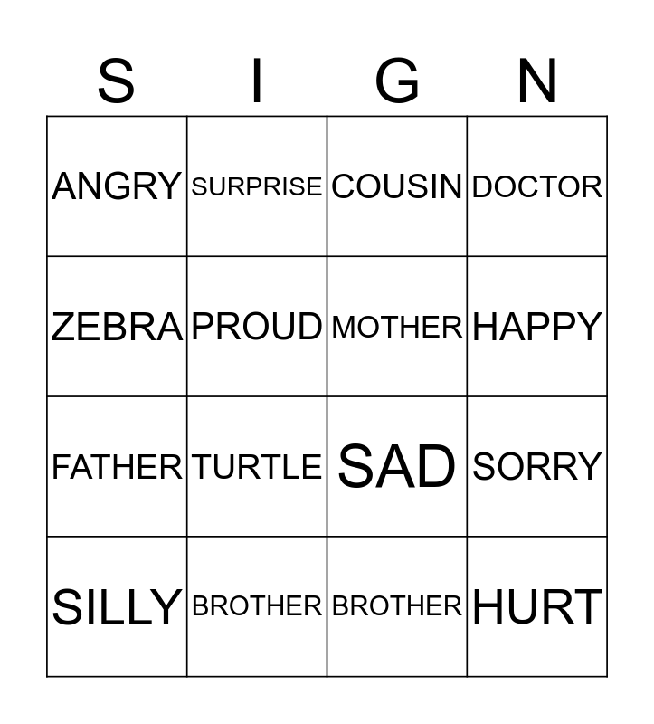 This bingo card has 16 words: BROTHER, SORRY, COUSIN, ANGRY, FATHER, SURPRISE, SAD, BROTHER, ZEBRA, PROUD, SILLY, DOCTOR, TURTLE, HAPPY, MOTHER and HURT.