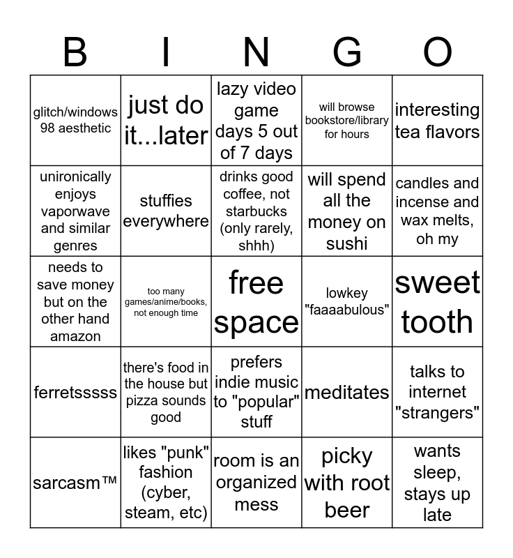 This bingo card has a free space and 24 words: there's food in the house but pizza sounds good, likes "punk" fashion (cyber, steam, etc), drinks good coffee, not starbucks (only rarely, shhh), sarcasm™, interesting tea flavors, glitch/windows 98 aesthetic, unironically enjoys vaporwave and similar genres, just do it...later, lowkey "faaaabulous", prefers indie music to "popular" stuff, will spend all the money on sushi, needs to save money but on the other hand amazon, meditates, talks to internet "strangers", stuffies everywhere, picky with root beer, sweet tooth, lazy video game days 5 out of 7 days, candles and incense and wax melts, oh my, too many games/anime/books, not enough time, wants sleep, stays up late, ferretsssss, will browse bookstore/library for hours and room is an organized mess.