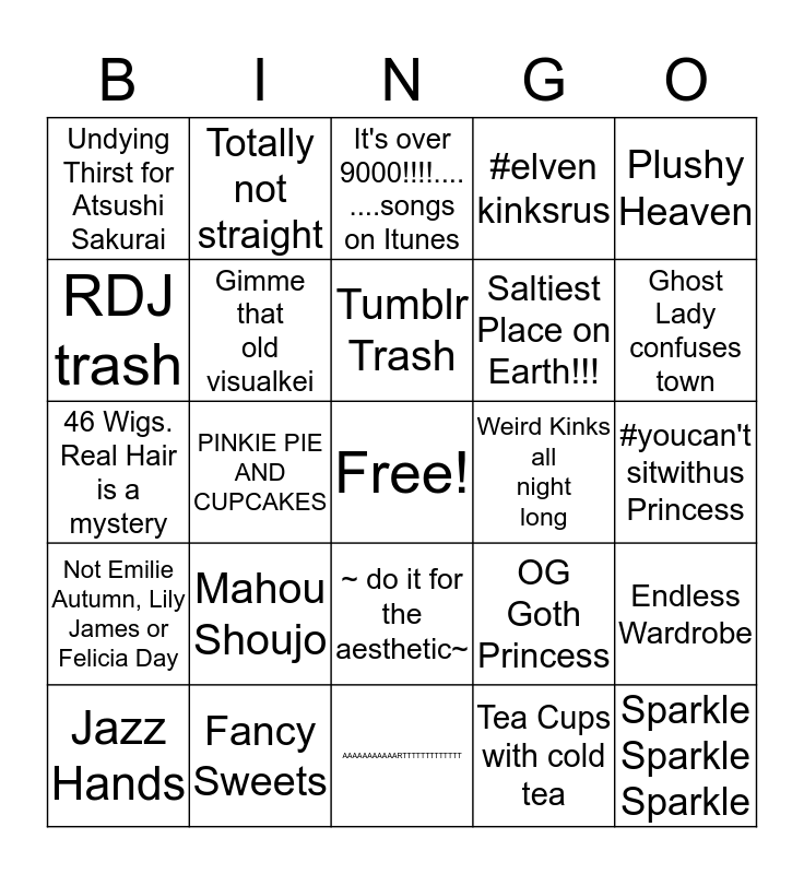 This bingo card has a free space and 24 words: Mahou Shoujo, Fancy Sweets, Tumblr Trash, Jazz Hands, Plushy Heaven, Undying Thirst for Atsushi Sakurai, RDJ trash, Totally not straight, Weird Kinks all night long, ~ do it for the aesthetic~, Saltiest Place on Earth!!!, 46 Wigs. Real Hair is a mystery, OG Goth Princess, Endless Wardrobe, Gimme that old visualkei, Tea Cups with cold tea, #youcan't sitwithus Princess, It's over 9000!!!!.... ....songs on Itunes, Ghost Lady confuses town, PINKIE PIE AND CUPCAKES, Sparkle Sparkle Sparkle, Not Emilie Autumn, Lily James or Felicia Day, #elven kinksrus and AAAAAAAAAAARTTTTTTTTTTTTT.