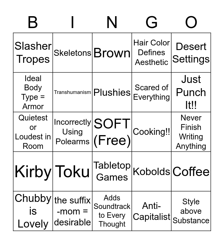 This bingo card has a free space and 24 words: Toku, the suffix -mom = desirable, Plushies, Chubby is Lovely, Desert Settings, Slasher Tropes, Ideal Body Type = Armor, Skeletons, Cooking!!, Tabletop Games, Scared of Everything, Quietest or Loudest in Room, Kobolds, Coffee, Transhumanism, Anti-Capitalist, Never Finish Writing Anything, Brown, Just Punch It!!, Incorrectly Using Polearms, Style above Substance, Kirby, Hair Color Defines Aesthetic and Adds Soundtrack to Every Thought.