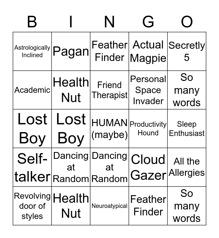 ⚠ This card has duplicate items: Doggos for days (2), So many words (2), Revolving door of styles (2), Neuroatypical (2), Dancing at Random (2), Self-talker (2), Pagan (2), Collector (2), Academic (2), Jewelry Junkie (2), Health Nut (2), Actual Magpie (2), All the Allergies (2), Cloud Gazer (2), Sleep Enthusiast (2), Journaler (2), Friend Therapist (2), Productivity Hound (2), Sarcasm Fluent (2), Secretly 5 (2), Lost Boy (2), Feather Finder (2), Astrologically Inclined (2)