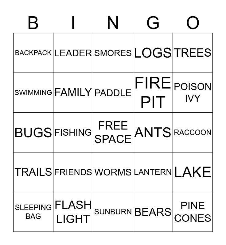 This bingo card has a free space and 24 words: FRIENDS, FLASH LIGHT, PADDLE, SLEEPING BAG, TREES, BACKPACK, SWIMMING, LEADER, ANTS, WORMS, FIRE PIT, BUGS, LANTERN, LAKE, FAMILY, BEARS, RACCOON, SMORES, POISON IVY, FISHING, PINE CONES, TRAILS, LOGS and SUNBURN.