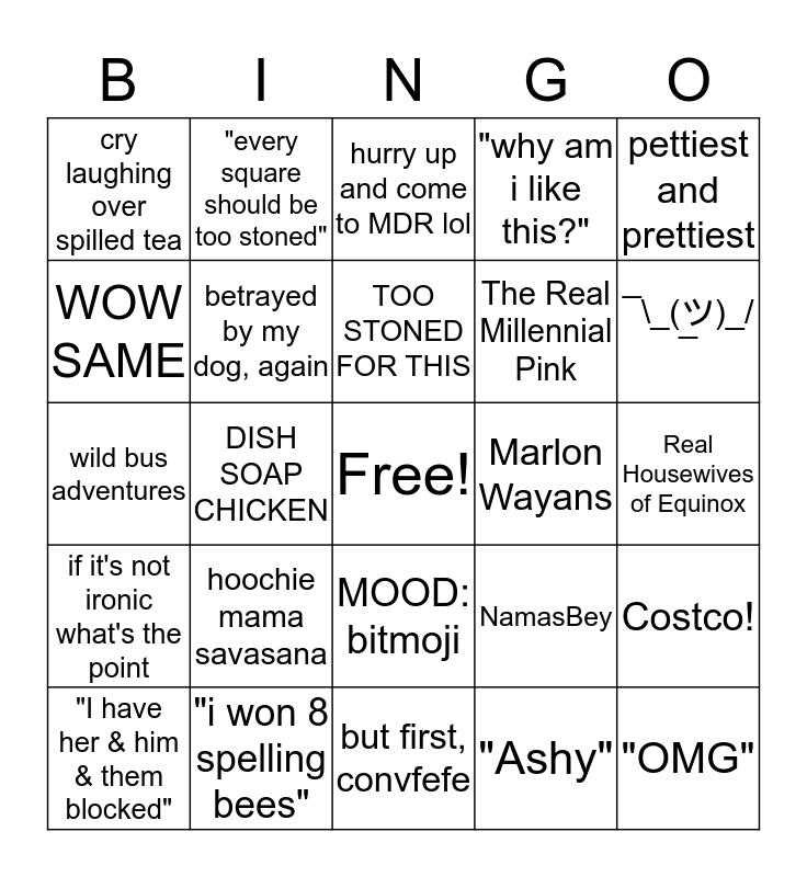 This bingo card has a free space and 24 words: hoochie mama savasana, "i won 8 spelling bees", TOO STONED FOR THIS, "I have her & him & them blocked", pettiest and prettiest, cry laughing over spilled tea, WOW SAME, "every square should be too stoned", Marlon Wayans, MOOD: bitmoji, The Real Millennial Pink, wild bus adventures, NamasBey, Costco!, betrayed by my dog, again, "Ashy", Real Housewives of Equinox, hurry up and come to MDR lol, ¯\_(ツ)_/¯, DISH SOAP CHICKEN, "OMG", if it's not ironic what's the point, "why am i like this?" and but first, convfefe.
