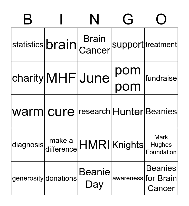 This bingo card has 25 words: make a difference, Beanie Day, June, generosity, treatment, statistics, charity, brain, Hunter, HMRI, pom pom, warm, Knights, Mark Hughes Foundation, MHF, Beanies for Brain Cancer, Beanies, Brain Cancer, fundraise, cure, research, donations, diagnosis, support and awareness.
