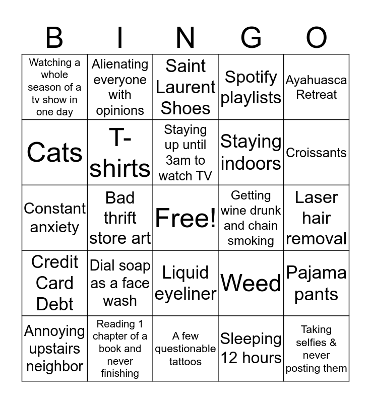 This bingo card has a free space and 24 words: Dial soap as a face wash, Reading 1 chapter of a book and never finishing, Staying up until 3am to watch TV, Annoying upstairs neighbor, Ayahuasca Retreat, Watching a whole season of a tv show in one day, Cats, Alienating everyone with opinions, Getting wine drunk and chain smoking, Liquid eyeliner, Staying indoors, Constant anxiety, Weed, Pajama pants, T-shirts, Sleeping 12 hours, Laser hair removal, Saint Laurent Shoes, Croissants, Bad thrift store art, Taking selfies & never posting them, Credit Card Debt, Spotify playlists and A few questionable tattoos.