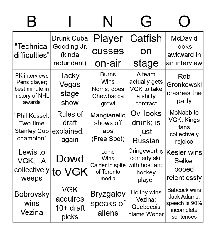 This bingo card has a free space and 24 words: Dowd to VGK, VGK acquires 10+ draft picks, Burns Wins Norris; does Chewbacca growl, Bobrovsky wins Vezina, McDavid looks awkward in an interview, "Technical difficulties", PK interviews Pens player; best minute in history of NHL awards, Drunk Cuba Gooding Jr. (kinda redundant), Ovi looks drunk; is just Russian, Laine Wins Calder in spite of Toronto media, A team actually gets VGK to take a shitty contract, "Phil Kessel: Two-time Stanley Cup champion", Cringeworthy comedy skit with host and hockey player, Kesler wins Selke; booed relentlessly, Tacky Vegas stage show, Holtby wins Vezina; Quebecois blame Weber, McNabb to VGK; Kings fans collectively rejoice, Player cusses on-air, Rob Gronkowski crashes the party, Rules of draft explained... again, Babcock wins Jack Adams; speech is 90% incomplete sentences, Lewis to VGK; LA collectively weeps, Catfish on stage and Bryzgalov speaks of aliens.