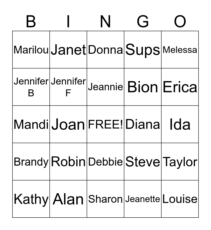 This bingo card has a free space and 24 words: Robin, Alan, Jeannie, Kathy, Melessa, Marilou, Jennifer B, Janet, Diana, Debbie, Bion, Mandi, Steve, Taylor, Jennifer F, Jeanette, Ida, Donna, Erica, Joan, Louise, Brandy, Sups and Sharon.
