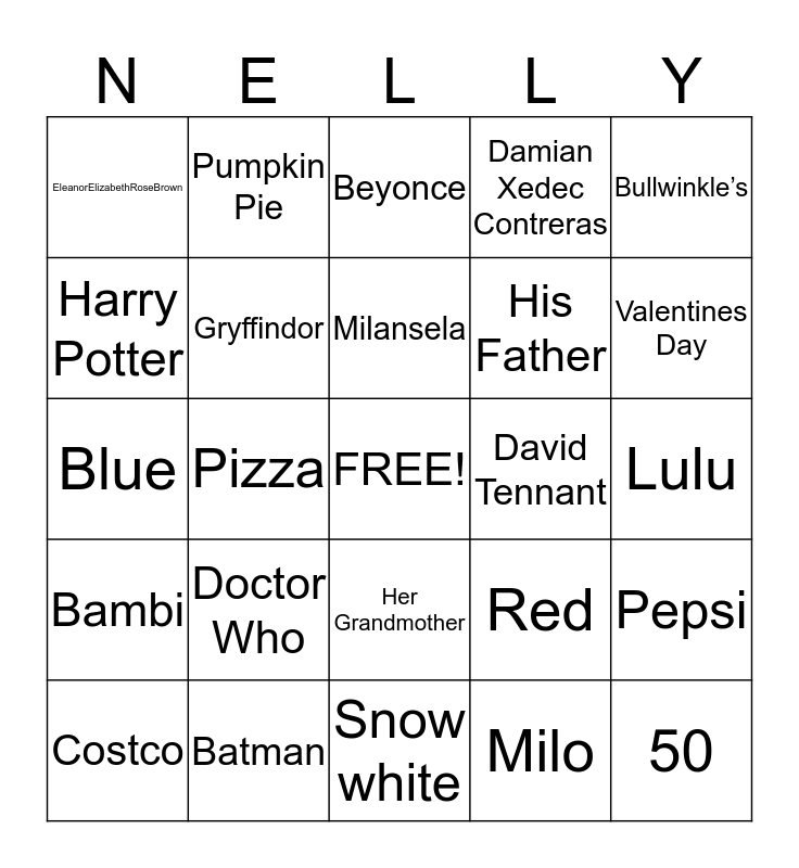 This bingo card has a free space and 29 words: Costco, Charming Charlie, Pizza, Slytherin, EleanorElizabethRoseBrown, Beyonce, Gryffindor, Doctor Who, David Tennant, Batman, Lulu, 50, Snow white, Milo, Valentines Day, SSX, Her Grandmother, Bambi, Bullwinkle’s, Blue, Red, Rainbow and Sparkles, His Father, Harry Potter, Damian Xedec Contreras, Pumpkin Pie, Pepsi, Milansela and Horachata.
