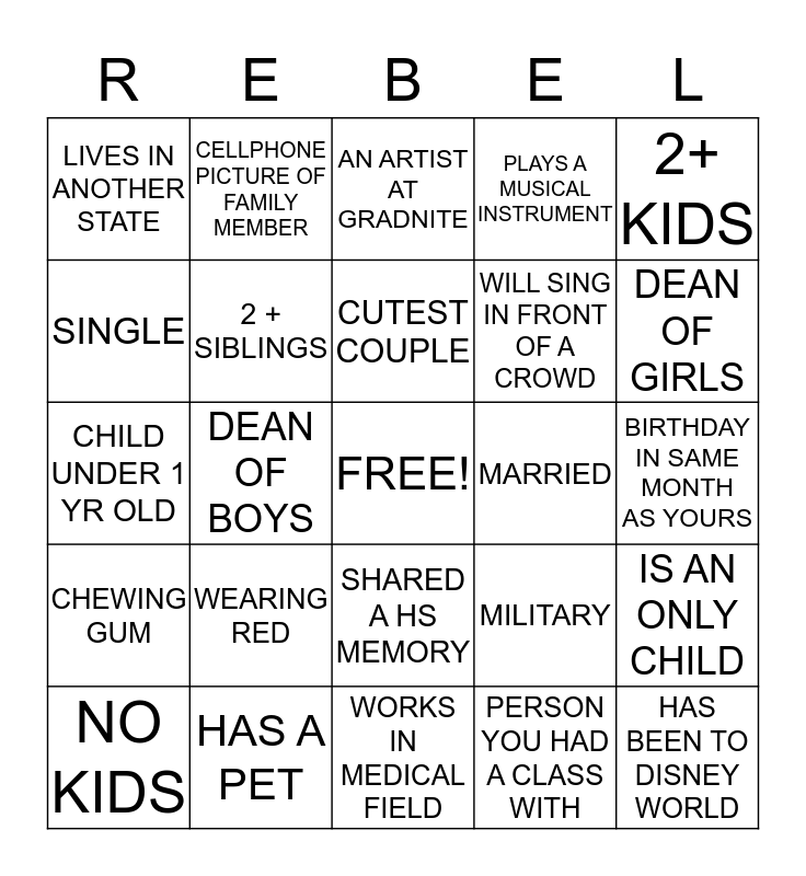 This bingo card has a free space and 24 words: WEARING RED, HAS A PET, CUTEST COUPLE, NO KIDS, 2+ KIDS, LIVES IN ANOTHER STATE, SINGLE, CELLPHONE PICTURE OF FAMILY MEMBER, MARRIED, SHARED A HS MEMORY, WILL SING IN FRONT OF A CROWD, CHILD UNDER 1 YR OLD, MILITARY, IS AN ONLY CHILD, 2 + SIBLINGS, PERSON YOU HAD A CLASS WITH, BIRTHDAY IN SAME MONTH AS YOURS, AN ARTIST AT GRADNITE, DEAN OF GIRLS, DEAN OF BOYS, HAS BEEN TO DISNEY WORLD, CHEWING GUM, PLAYS A MUSICAL INSTRUMENT and WORKS IN MEDICAL FIELD.