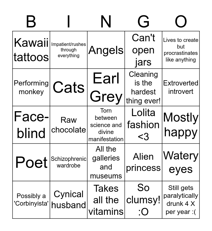 This bingo card has 25 words: Schizophrenic wardrobe, Takes all the vitamins, Earl Grey, Possibly a 'Corbinyista', Lives to create but procrastinates like anything, Kawaii tattoos, Performing monkey, Impatient/rushes through everything, Lolita fashion <3, All the galleries and museums, Cleaning is the hardest thing ever!, Face-blind, Alien princess, Watery eyes, Cats, Still gets paralytically drunk 4 X per year :(, Mostly happy, Angels, Extroverted introvert, Raw chocolate, Torn between science and divine manifestation, Cynical husband, Poet, Can't open jars and So clumsy! :O.
