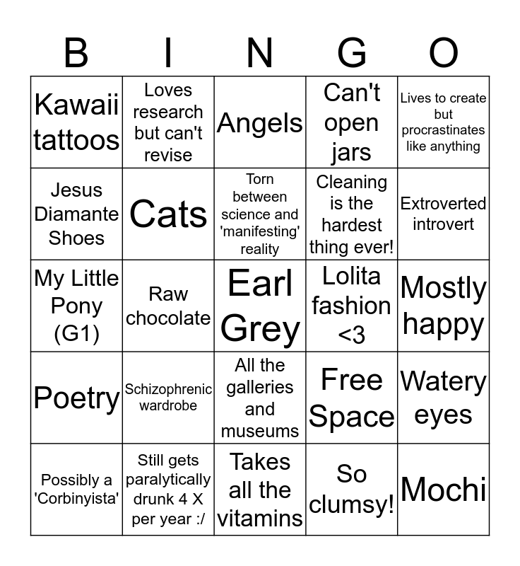 This bingo card has 25 words: Schizophrenic wardrobe, Takes all the vitamins, Torn between science and 'manifesting' reality, Possibly a 'Corbinyista', Lives to create but procrastinates like anything, Kawaii tattoos, Jesus Diamante Shoes, Loves research but can't revise, Lolita fashion <3, All the galleries and museums, Cleaning is the hardest thing ever!, My Little Pony (G1), Free Space, Watery eyes, Cats, Mochi, Mostly happy, Angels, Extroverted introvert, Raw chocolate, Earl Grey, Still gets paralytically drunk 4 X per year :/, Poetry, Can't open jars and So clumsy!.