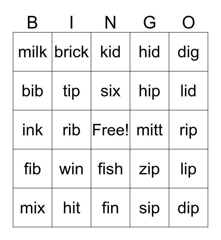 This bingo card has a free space and 24 words: win, hit, six, mix, dig, milk, bib, brick, mitt, fish, hip, ink, zip, lip, tip, sip, rip, kid, lid, rib, dip, fib, hid and fin.