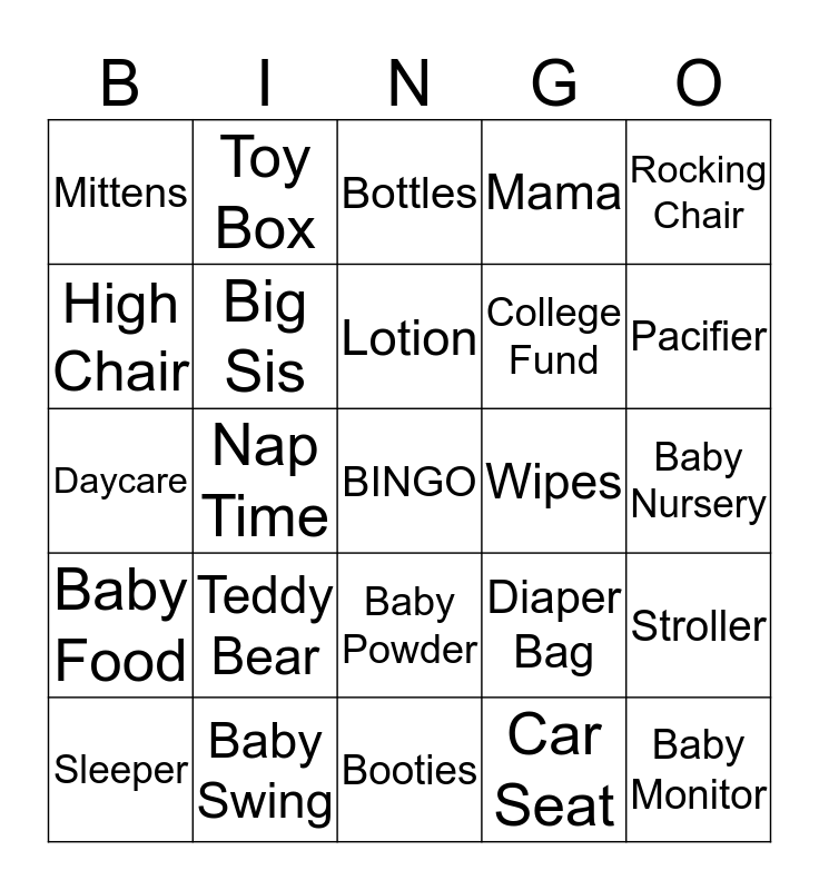 This bingo card has a free space and 24 words: Teddy Bear, Baby Swing, Lotion, Sleeper, Rocking Chair, Mittens, High Chair, Toy Box, Wipes, Baby Powder, College Fund, Daycare, Diaper Bag, Stroller, Big Sis, Car Seat, Baby Nursery, Bottles, Pacifier, Nap Time, Baby Monitor, Baby Food, Mama and Booties.