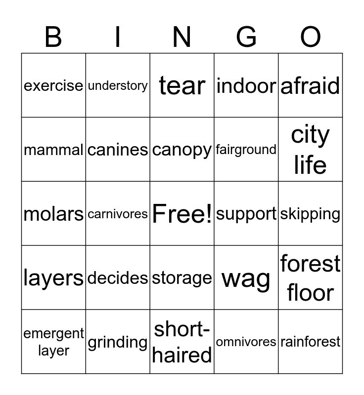 This bingo card has a free space and 24 words: decides, grinding, canopy, emergent layer, afraid, exercise, mammal, understory, support, storage, fairground, molars, wag, forest floor, canines, omnivores, skipping, tear, city life, carnivores, rainforest, layers, indoor and short-haired.
