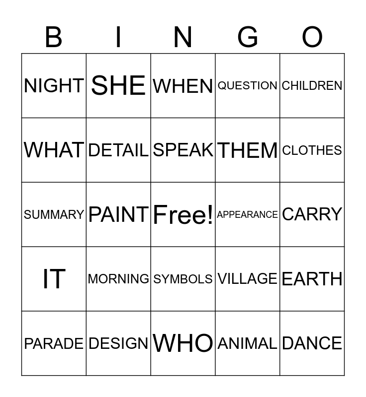 This bingo card has a free space and 27 words: VILLAGE, HOW, THEM, WHO, WHAT, WHEN, SHE, IT, APPEARANCE, EARTH, SUMMARY, QUESTION, PARADE, DESIGN, CLOTHES, REGION, DETAIL, SPEAK, MORNING, NIGHT, CARRY, ANIMAL, PAINT, DANCE, SYMBOLS, CHILDREN and SIMPLE.