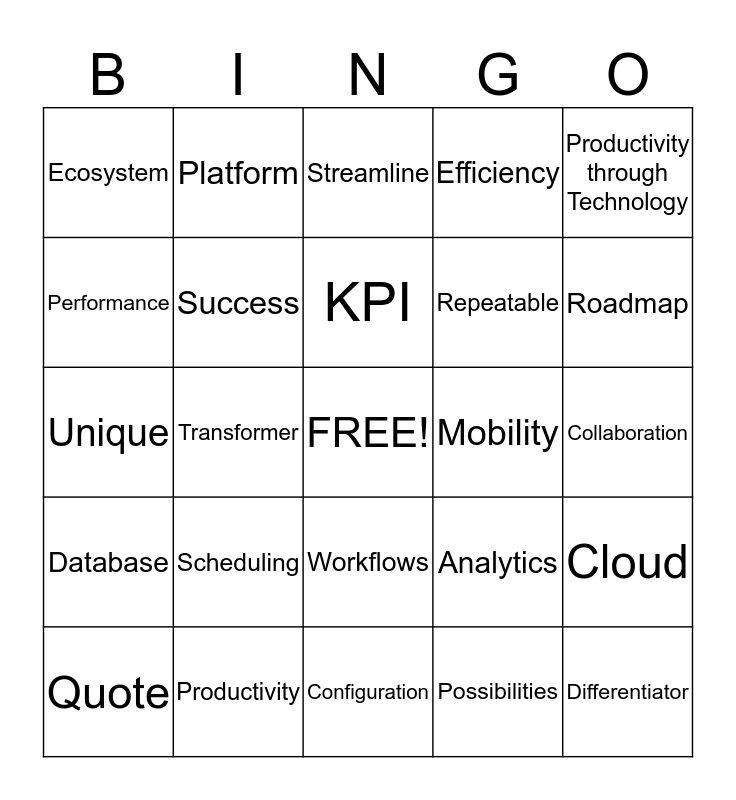 This bingo card has a free space and 45 words: Customer Story, Differentiator, People, Quote, Power, Possibilities, Streamline, Reliability, Productivity through Technology, Productivity, Efficiency, Mobility, Workflows, Scheduling, Dashboards, Configuration, Strategic, Unique, Best practice, Roadmap, Platform, Innovation, Trusted, Ecosystem, Council, Collaboration, 5 Pillars, Applications, Analytics, Database, Technology, Cloud, Real-time, Game changing, Use Case, Transformer, Comprehensive, Execution, Lifecycle, KPI, Performance, Repeatable, Focused, Success and Thank You.