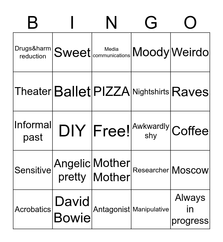 This bingo card has a free space and 24 words: Angelic pretty, David Bowie, PIZZA, Acrobatics, Weirdo, Drugs&harm reduction, Theater, Sweet, Awkwardly shy, Mother Mother, Nightshirts, Informal past, Researcher, Moscow, Ballet, Manipulative, Coffee, Media communications, Raves, DIY, Always in progress, Sensitive, Moody and Antagonist.