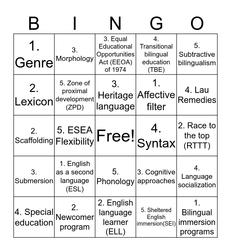 This bingo card has a free space and 25 words: 1. English as a second language (ESL), 2. English language learner (ELL), 3. Heritage language, 4. Special education, 5. Subtractive bilingualism, 1. Genre, 2. Lexicon, 3. Morphology, 4. Syntax, 5. Phonology, 1. Affective filter, 2. Scaffolding, 3. Cognitive approaches, 4. Language socialization, 5. Zone of proximal development (ZPD), 1. No child left behind act (NCLB) of 2001, 2. Race to the top (RTTT), 3. Equal Educational Opportunities Act (EEOA) of 1974, 4. Lau Remedies, 5. ESEA Flexibility, 1. Bilingual immersion programs, 2. Newcomer program, 3. Submersion, 4. Transitional bilingual education (TBE) and 5. Sheltered English immersion(SEI).