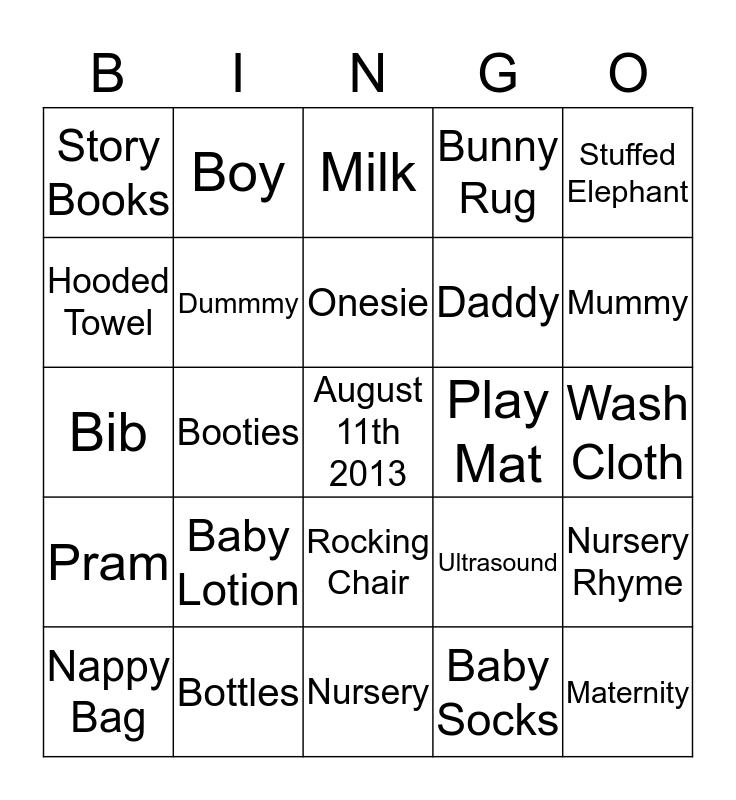 This bingo card has a free space and 24 words: Baby Lotion, Bottles, Onesie, Nappy Bag, Stuffed Elephant, Story Books, Hooded Towel, Boy, Play Mat, Rocking Chair, Daddy, Bib, Ultrasound, Nursery Rhyme, Dummmy, Baby Socks, Wash Cloth, Milk, Mummy, Booties, Maternity, Pram, Bunny Rug and Nursery.