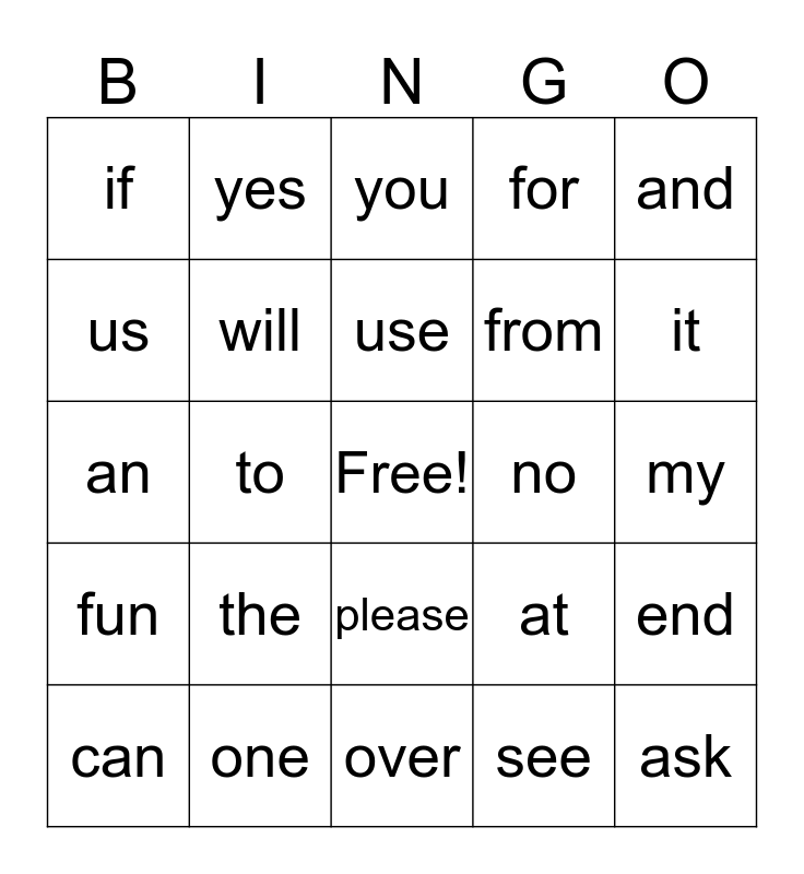 This bingo card has a free space and 24 words: the, one, use, can, and, if, us, yes, no, please, from, an, at, end, will, see, my, you, it, to, ask, fun, for and over.