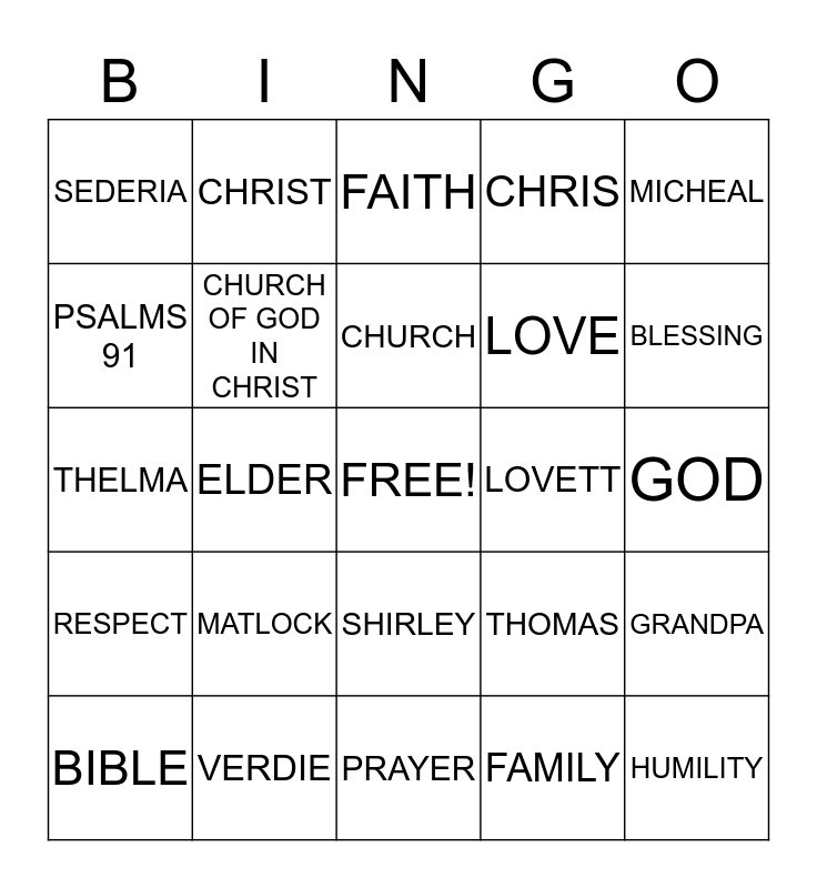 This bingo card has a free space and 24 words: MATLOCK, VERDIE, CHURCH, BIBLE, MICHEAL, SEDERIA, PSALMS 91, CHRIST, LOVETT, SHIRLEY, LOVE, THELMA, THOMAS, GRANDPA, CHURCH OF GOD IN CHRIST, FAMILY, GOD, FAITH, BLESSING, ELDER, HUMILITY, RESPECT, CHRIS and PRAYER.