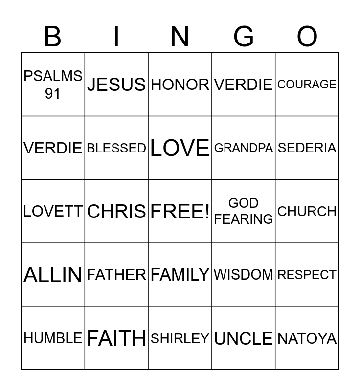 This bingo card has a free space and 24 words: FATHER, FAITH, LOVE, HUMBLE, COURAGE, PSALMS 91, VERDIE, JESUS, GOD FEARING, FAMILY, GRANDPA, LOVETT, WISDOM, RESPECT, BLESSED, UNCLE, CHURCH, HONOR, SEDERIA, CHRIS, NATOYA, ALLIN, VERDIE and SHIRLEY.