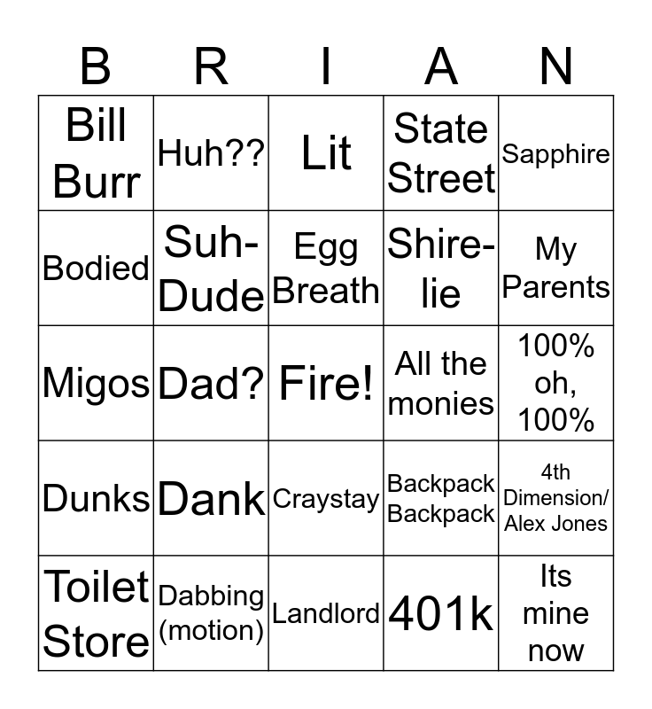 This bingo card has a free space and 24 words: Dank, Dabbing (motion), Egg Breath, Toilet Store, Sapphire, Bill Burr, Bodied, Huh??, All the monies, Craystay, Shire-lie, Migos, Backpack Backpack, 4th Dimension/ Alex Jones, Suh-Dude, 401k, 100% oh, 100%, Lit, My Parents, Dad?, Its mine now, Dunks, State Street and Landlord.