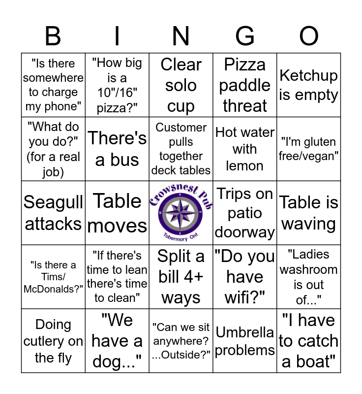 This bingo card has a free space and 24 words: "If there's time to lean there's time to clean", "We have a dog...", Customer pulls together deck tables, Doing cutlery on the fly, Ketchup is empty, "Is there somewhere to charge my phone", "What do you do?" (for a real job), "How big is a 10"/16" pizza?", Trips on patio doorway, Split a bill 4+ ways, Hot water with lemon, Seagull attacks, "Do you have wifi?", "Ladies washroom is out of...", There's a bus, Umbrella problems, Table is waving, Clear solo cup, "I'm gluten free/vegan", Table moves, "I have to catch a boat", "Is there a Tims/ McDonalds?", Pizza paddle threat and "Can we sit anywhere? ...Outside?".