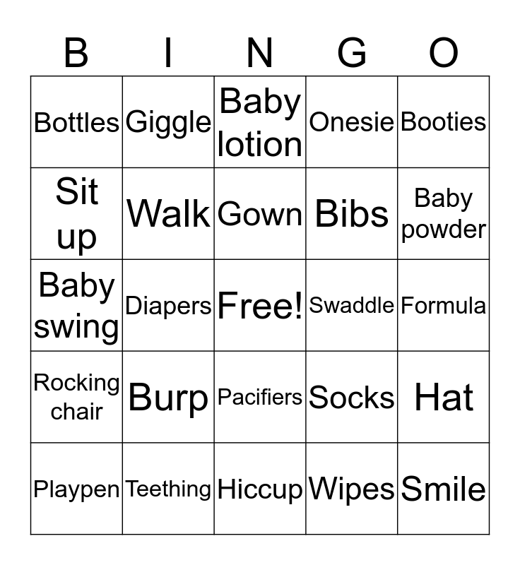 This bingo card has a free space and 50 words: Cry, Smile, Coo, Hiccup, Burp, Babble, Giggle, Roll over, Sit up, Crawl, Walk, Onesie, Hat, Socks, Shoes, Sleepers, Gown, Swaddle, Mittens, Booties, Diapers, Wipes, Bottles, Bibs, Burp cloths, blankets, Baby powder, Baby oil, Baby lotion, Pacifiers, Rattle, Crib, Mobile, Books, Teething, Diaper bag, Changing pad, Bowls, Baby spoons, Formula, High chair, Walker, Bouncer, Pack n’ play, Playpen, Baby swing, Car seat, Stroller, Rocking chair and Bassinet.