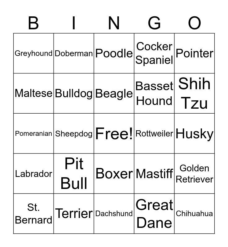 This bingo card has a free space and 30 words: Terrier, Yorkie, Sheepdog, Dalmation, Greyhound, Poodle, Bulldog, Boxer, Rottweiler, Dachshund, Husky, Chihuahua, Great Dane, Pug, Shih Tzu, Schnauzer, Mastiff, Labrador, Pit Bull, Pointer, Pomeranian, Border Collie, Doberman, Basset Hound, Maltese, Cocker Spaniel, Golden Retriever, St. Bernard, Beagle and German Shepherd.