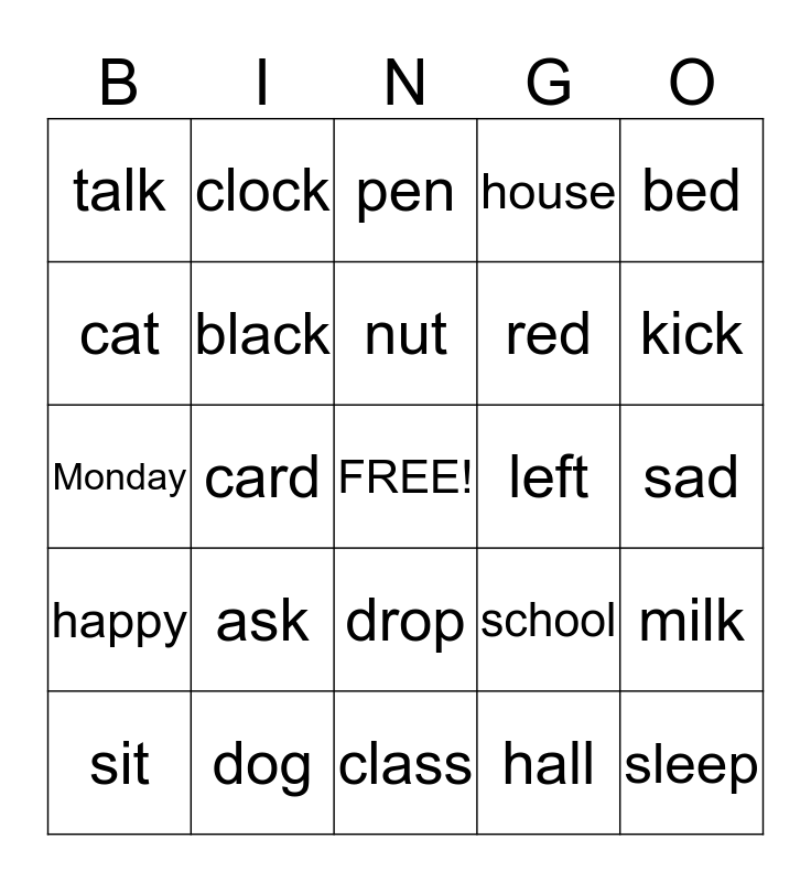 This bingo card has a free space and 24 words: ask, dog, nut, sit, bed, talk, cat, clock, left, drop, red, Monday, school, milk, black, hall, sad, pen, kick, card, sleep, happy, house and class.