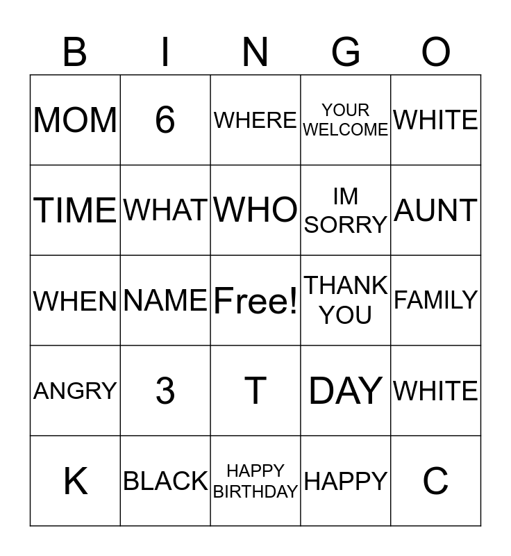This bingo card has a free space and 24 words: 3, BLACK, WHO, K, WHITE, MOM, TIME, 6, THANK YOU, T, IM SORRY, WHEN, DAY, WHITE, WHAT, HAPPY, FAMILY, WHERE, AUNT, NAME, C, ANGRY, YOUR WELCOME and HAPPY BIRTHDAY.