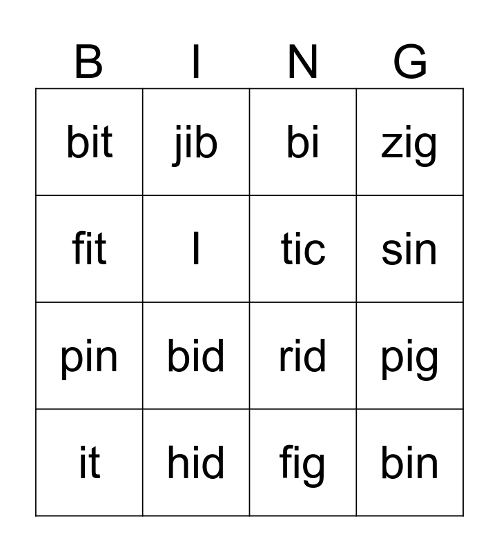 This bingo card has 16 words: hid, pig, bi, bit, pin, jib, rid, fig, fit, I, it, zig, bid, sin, tic and bin.